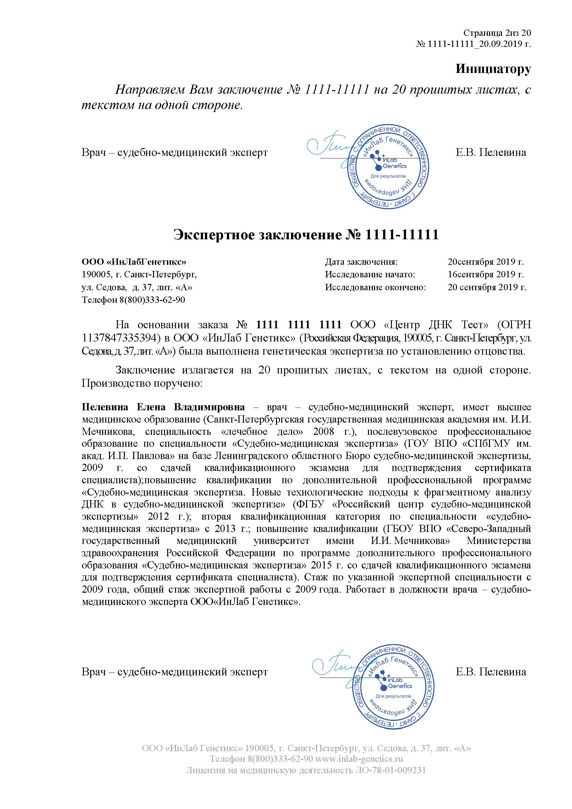 Лаборатория имеет полную аккредитацию и сертификацию. Наши заключения являются полными и развернутыми. Генетическая экспертиза ДНК становится основным доказательством в судебных спорах и принимаются всеми судами и государственными учреждениями Российской Федерации.